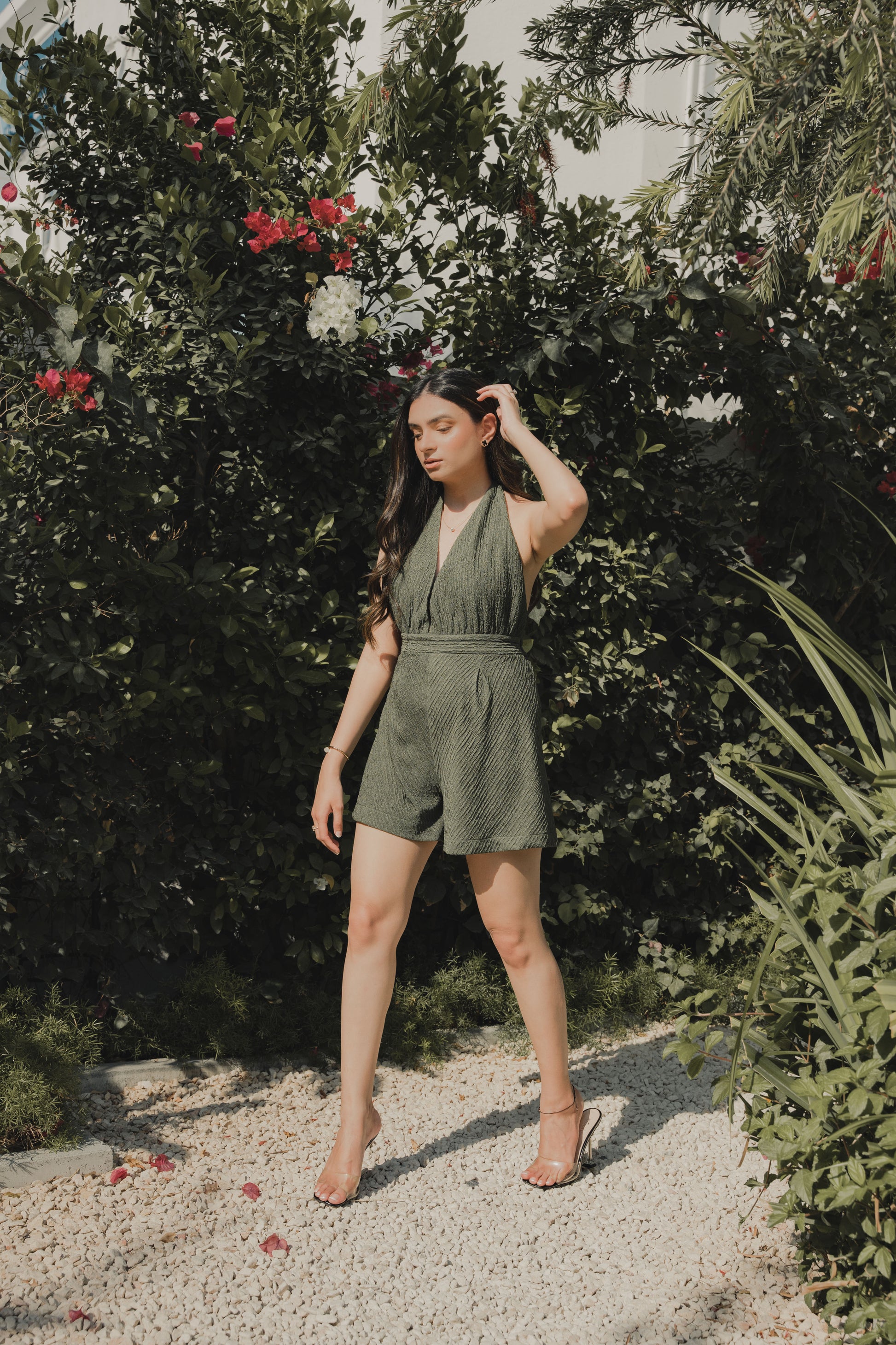 A halter neck backless romper finished with loose shorts on the bottom and secured with an elastic waistband.